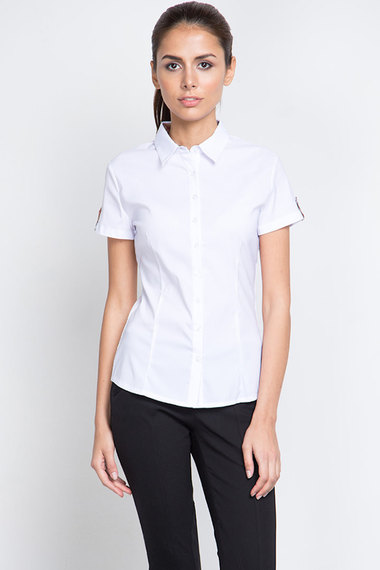 Белая блузка с короткими рукавами, сшита из хлопковой ткани с добавление полиэстера. Интересные детали: манжеты рукавов и внутренняя часть воротника украшены клетчатой ткань с модным принтом.
