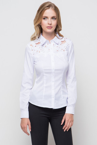 Красивая белая блузка с длинными рукавами, приталенного кроя. Модель украшена большими цветочными аппликациями на плечах.
