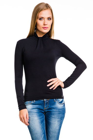 Черная водолазка из вискозы, модель с длинным рукавом, и горловиной гольф, украшеной декоративной складкой.