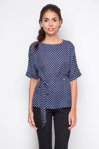 Модная блузка с рукавами 3/4 и вшитым поясом. Стильный принт блузки "горох" на темно-синем фоне и широкие рукава делают модель оригинальной и модной.